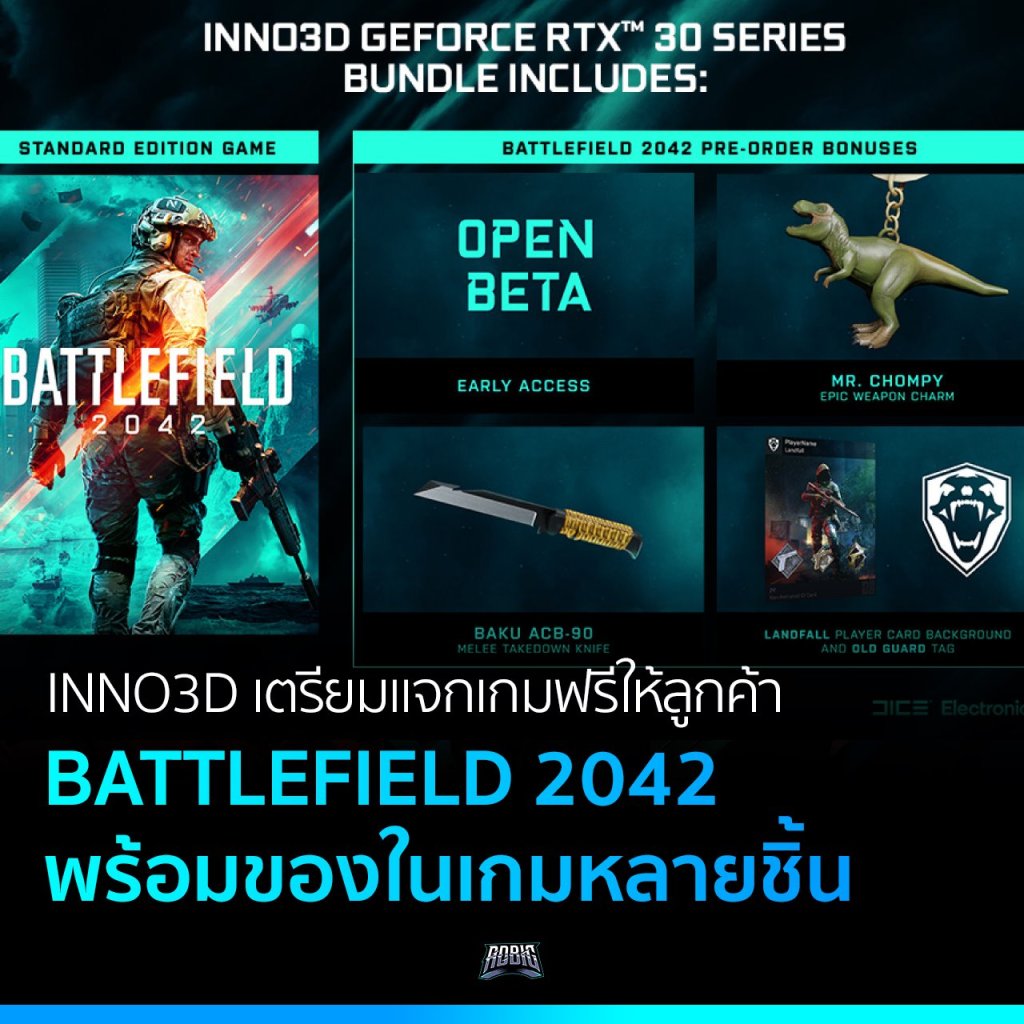 INNO3D เตรียมบันเดิลเกมฟรี Battlefield 2042 สำหรับลูกค้าที่ซื้อการ์ดจอ GeForce RTX 3090, 3080 Ti, 3080, 3070 Ti และ 3070 รวมไปถึงเครื่องที่ประกอบสำเร็จโดยใช้การ์ดจอรุ่นต่าง ๆ ตามที่บอก