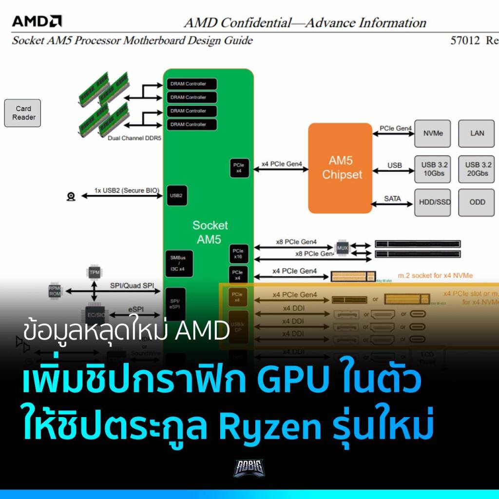 เป็นข้อมูลหลุดจากเอกสารภายในเกี่ยวกับรายละเอียดของซ็อกเก็ต AM5 มีการพูดถึงชิป CPU Ryzen ที่มีส่วนของกราฟิกอยู่ในตัวแต่ถูกปิดการทำงานเอาไว้ด้วย คาดว่าจะเป็นชิปที่ออกแบบมาเพื่อชนกับชิปซีรีส์ F ของ Intel ที่ต้องใช้กับการ์ดจอแยก