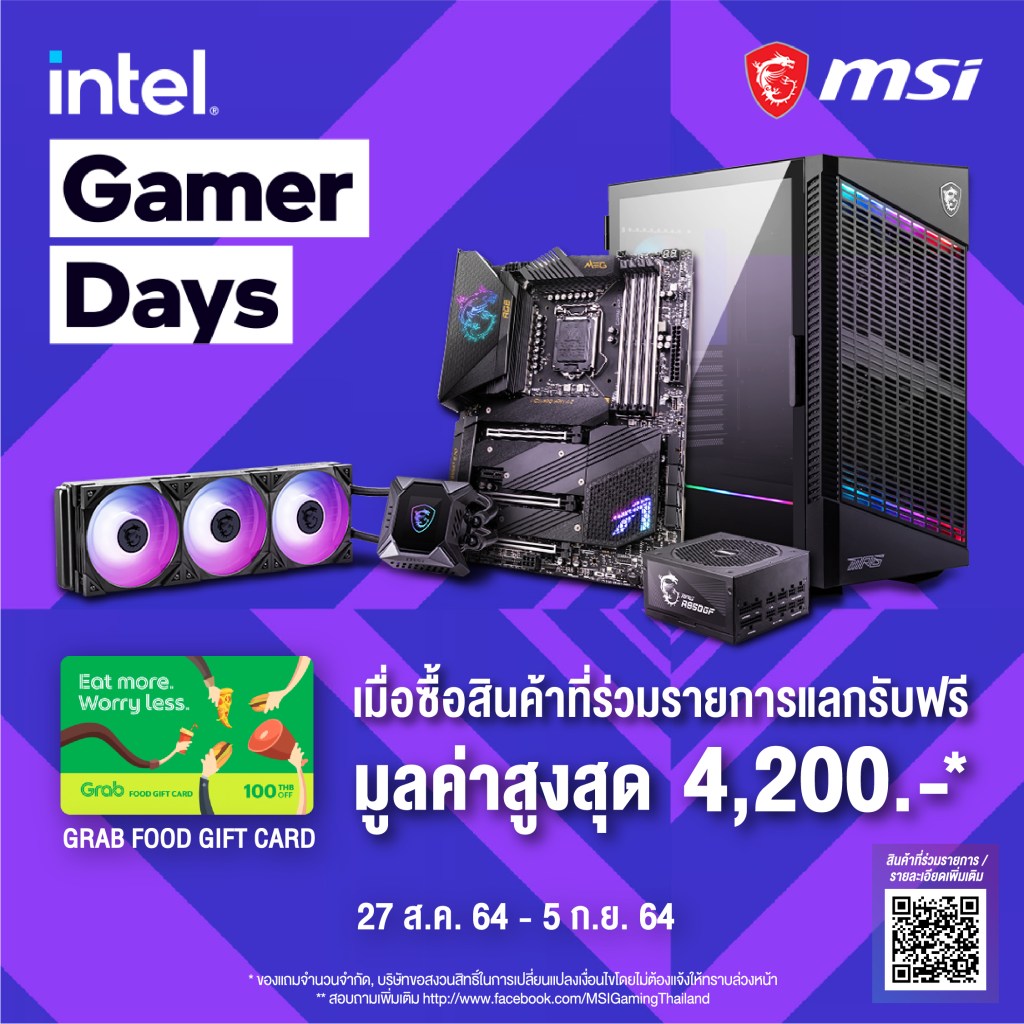 MSI แบรนด์ผู้นำระดับโลกด้านอุปกรณ์คอมพิวเตอร์และสินค้าเกมมิ่ง ตอกย้ำความเป็นผู้นำด้วยการเปิดโปรโมชั่นเด็ด พร้อมเข้าร่วมเทศกาลเกมมิ่งสุดมันส์ Intel Gamer Days ระหว่างวันที่ 27 ส.ค. 2564 – 5 ก.ย. 2564 โดยเมื่อซื้อสินค้า MSI ที่ร่วมรายการ แลกรับฟรี Grab food gift card มูลค่าสูงสุดถึง 4,200 บาท โดยสินค้าที่ร่วมรายการประกอบด้วย เมนบอร์ด MSI Z590, B560, เกมมิ่งเคส MSI, ชุดระบายความร้อนด้วยน้ำ, พาวเวอร์ ซัพพลาย