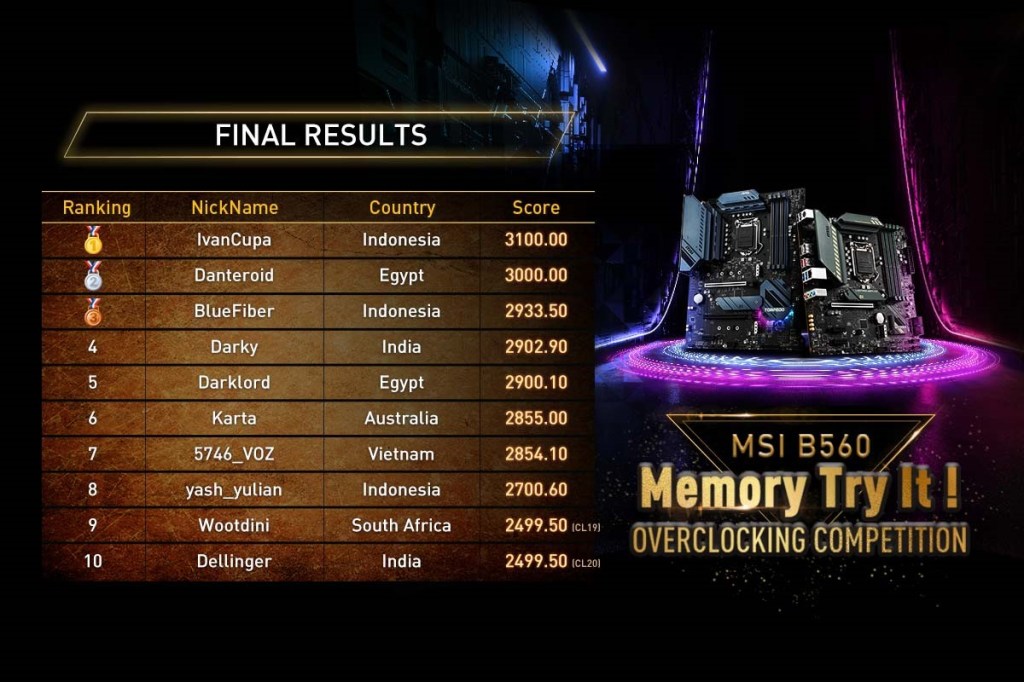 ผู้เข้าแข่งขันที่ใช้ชือว่า IvanCupa จากอินโดนีเซียเป็นผู้ที่ชนะเลิศไปด้วยความเร็วแรม DDR4 ที่ 6200MHz โดยใช้แรม G.Skill Trident ซีรีส์ คู่กับเมนบอร์ด MSI B560-A PRO ซึ่งเป็นเมนบอร์ดที่มีสล็อตแรม 2 สล็อตซึ่งถึงแม้จะไม่ใช่เมนบอร์ดที่ออกแบบมาสำหรับการโอเวอร์คล็อคแบบสุดขั้ว แต่ก็ยังสามารถเร่งความเร็วของแรมไปได้สูงมากแบบสบายๆ
