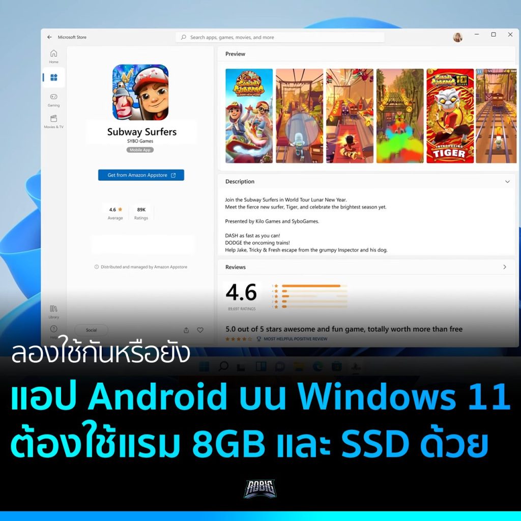 Windows 11 ได้เปิดตัวอัปเดตเวอร์ชันใหม่ล่าสุดให้สามารถโหลดแอประบบ Android มาใช้งานบน PC กันได้แล้ว แต่ความต้องการของระบบขั้นต่ำนั้น ต้องมีแรมในเครื่องอย่างน้อย 8GB ถึงจะสามารถใช้งานแอปได้ และดีกว่าถ้าหากมีแรมที่ 16GB