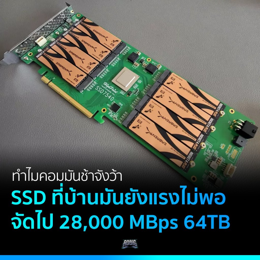 จริง ๆ อันนี้ไม่ใช่ SSD ตัวเดียว แต่เป็นการจับเอา SSD M.2 ความจุ 8TB ทั้งหมด 8 ตัว มาเสียบรวมทำงานกันแบบ RAID ให้เป็นไดรฟ์เดียวกันบนแผงวงจรเดียวกันเสียบต่อผ่าน PCIe 4.0 ความจุรวมทั้งหมดที่ 64TB