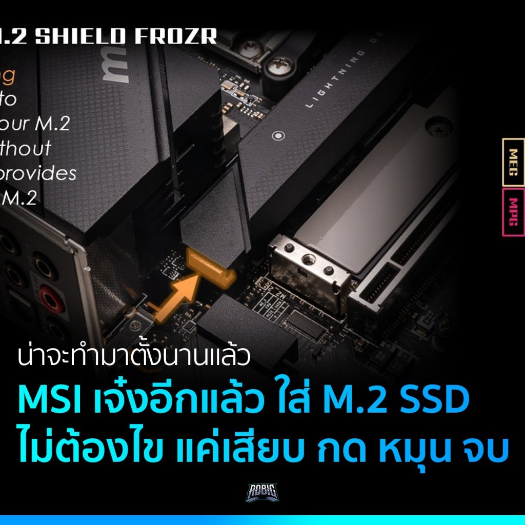 ส่วนอีกแบบคือ M.2 Shield Frozr เป็นแผ่นชีลด์ปิดครอบทับบนตัว SSD อีกที พร้อมกับช่วยระบายความร้อนด้วยในตัว ซึ่งดีไซน์ใหม่นี้ไม่ต้องใช้การหมุนหรือไขใด ๆ เพราะที่ด้านหลังนั้นออกแบบมาให้เป็นสลักล็อกแบบแรงดันสปริง แค่ดันกดลงไปก็เป็นอันเสร็จ ง่ายสุด ๆ