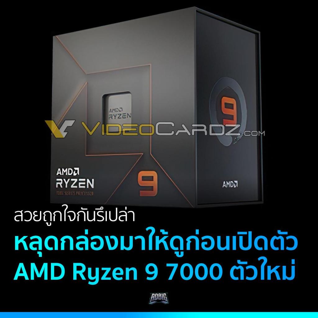 หลุดภาพกล่อง AMD Ryzen 9 7000 ตระกูลใหม่มาให้ดูกันแล้ว มาในโทนสีดำเหมือนเช่นเคย แล้วก็ตัดด้วยสีส้มแดง ด้านหน้าจะเป็นลายเส้นกรอบสี่เหลี่ยมที่กลางกล่อง พร้อมช่องหน้าต่างให้มองเห็นทะลุเข้าไปที่ตัวหน้าสัมผัส CPU ด้านใน ส่วนรอบ ๆ จะเป็นเส้นที่มุมมีการแตกออกไปให้เห็นโลโก้ของ AMD มีกำกับชื่อรุ่นที่มุมซ้ายล่าง และเลขซีรีส์รุ่นที่มุมขวาล่าง ส่วนด้านข้างจะเป็นเลขซีรีส์รุ่นอีกตำแหน่ง พร้อมโลโก้วงกลม Ryzen ล้อมรอบ และโลโก้ AMD ที่ด้านล่าง