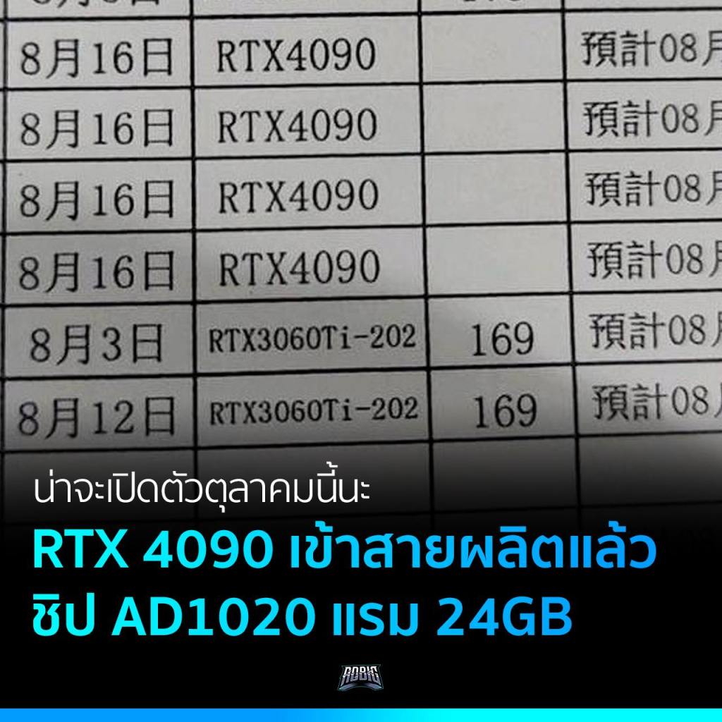 เอกสารข้อมูลภายในจากโรงงาน OEM ผู้ผลิตการ์ดจอ NVIDIA GeForce RTX 4090 หลุดข้อมูลเริ่มเดินสายการผลิตแล้วตั้งแต่วันที่ 16 สิงหาคม ที่ผ่านมา