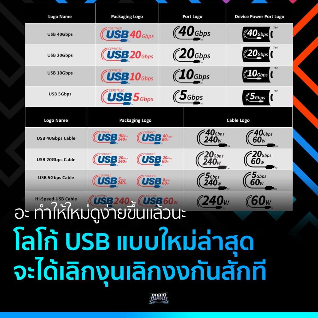 หน่วยงานที่กำกับดูแลเรื่องนี้ก็คือ The USB Implementors Forum นั่นเอง ปล่อยภาพโลโก้ใหม่สำหรับพอร์ตบนโน้ตบุ๊ก, หัวชาร์จ และสายออกมาให้ได้เห็นกันเรียบร้อย เพื่อสื่อสารให้ผู้ใช้อย่างเรา ๆ เลิกงงกันเสียที