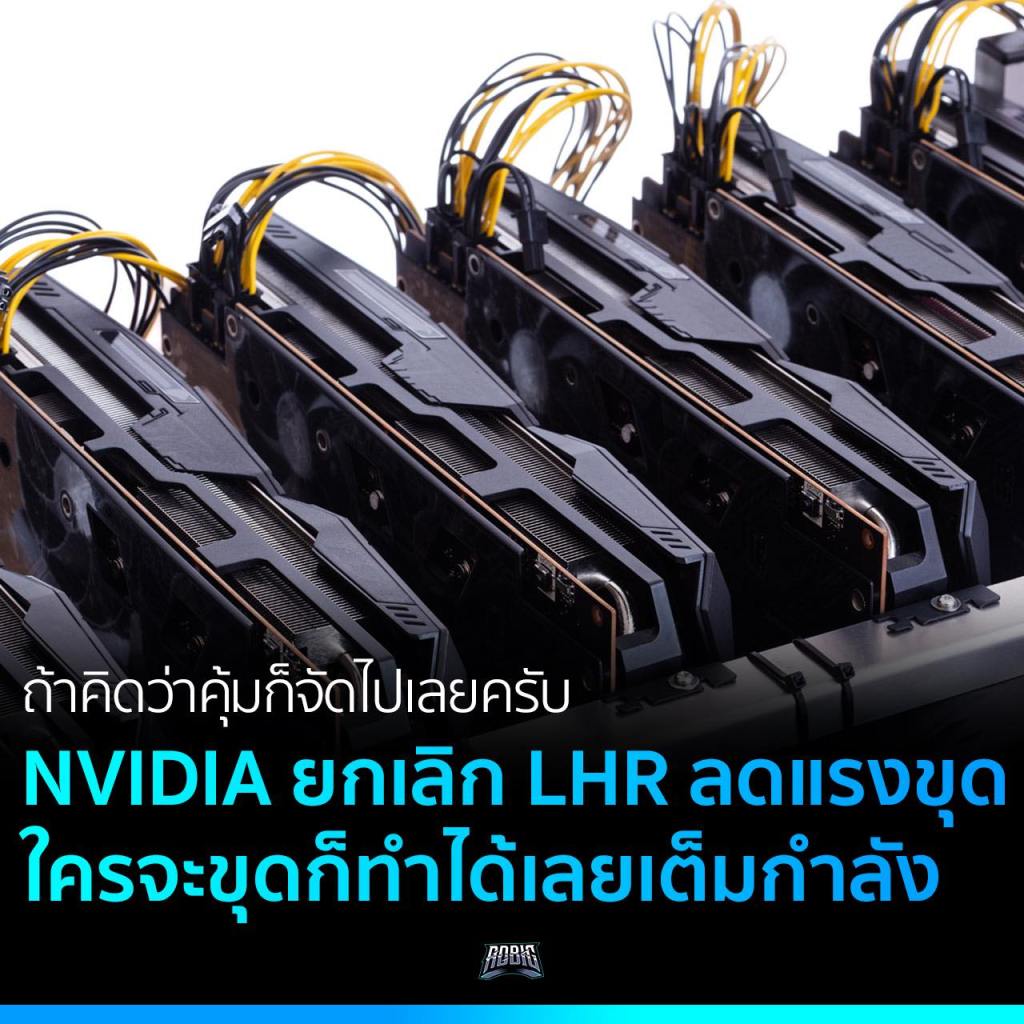 สำหรับการแตกของเหมืองเป็นที่เรียบร้อย NVIDIA ก็เลยประกาศว่าจะไม่มี LHR หรือ Lite Hash Rate ที่เป็นการจำกัดแรงขุดในการ์ดจออีกต่อไปแล้ว โดยปลดออกจากไดรเวอร์เวอร์ชันล่าสุด ทำให้การ์ดตระกูล RTX 30 สามารถขุดได้เต็มประสิทธิภาพเหมือนเดิม แต่คงน่าจะไม่ค่อยมีใครเอาไปใช้ขุดกันหรอก มั้ง