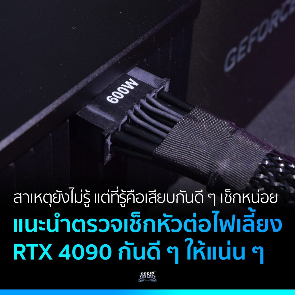 อย่างแรกคือเช็กที่หัวสายให้ดี ๆ ว่าเสียบได้อย่างแน่นหนาหรือเปล่า เพราะว่าหัวแบบใหม่ 12VHPWR ตัวนี้จะไม่ได้ดีไซน์เขี้ยวล็อกมาเหมือนกับหัวแบบ 8 พิน แบบเก่า ดังนั้นอาจเกิดการเสียบที่ไม่ค่อยแน่นหนา หรือการเกิดจากการบิดงอของสายจนทำให้หัวขยับไม่แน่นได้