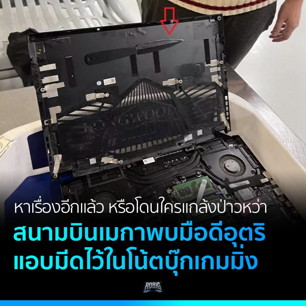 ตัวเครื่องรุ่นดังกล่าวเป็น Gigabyte Aorus โดยแปะมีดที่ว่านี้เอาไว้ที่ฝาใต้เครื่องโน้ตบุ๊ก ซึ่งต้องไขเปิดออกมาถึงจะเห็น แต่แน่นอนว่ามันต้องผ่านเครื่องเอกซเรย์อยู่แล้ว ยังไงก็ไม่รอด