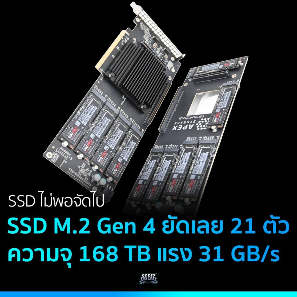 Apex Storage X21 AIC จัดไปสล็อตใส่ SSD M.2 Gen 4 จำนวน 21 ช่องไปเลยเต็ม ๆ จำนวนเลน PCIe ทั้งหมด 100 เลน รองรับความจุได้สูงสุด 168 TB