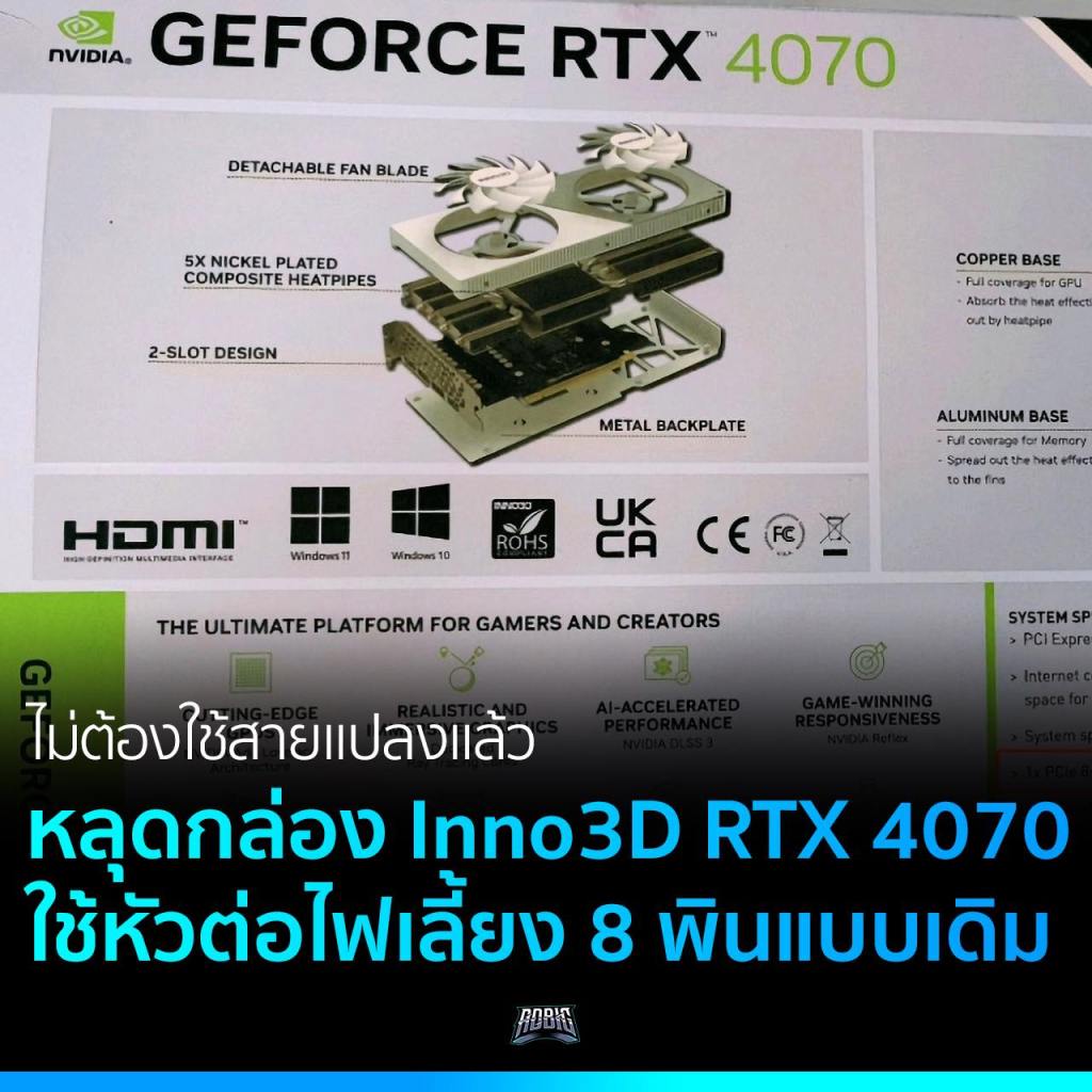 Inno3D GeForce RTX 4070 หลุดหน้ากล่องการ์ดจอใหม่มาเพิ่มแล้ว โดยจะมาพร้อมกับหัวต่อไฟเลี้ยงแบบ 8 พิน ไม่ใช่แบบ 12 พินใหม่ที่ใช้ในรุ่นพี่ก่อนหน้านี้