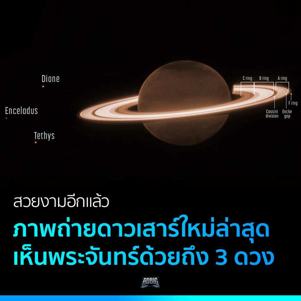 แต่ที่ส่วนของวงแหวนนั้นจะสว่างกว่ามากอย่างเห็นได้ชัด ซึ่งมีหลายชั้นด้วย และยังได้เห็นดวงจันทร์ของดาวเสาร์อีกด้วย ซึ่งมีจำนวนมากถึง 3 ดวง คือ Dione, Enceladus และ Tethys