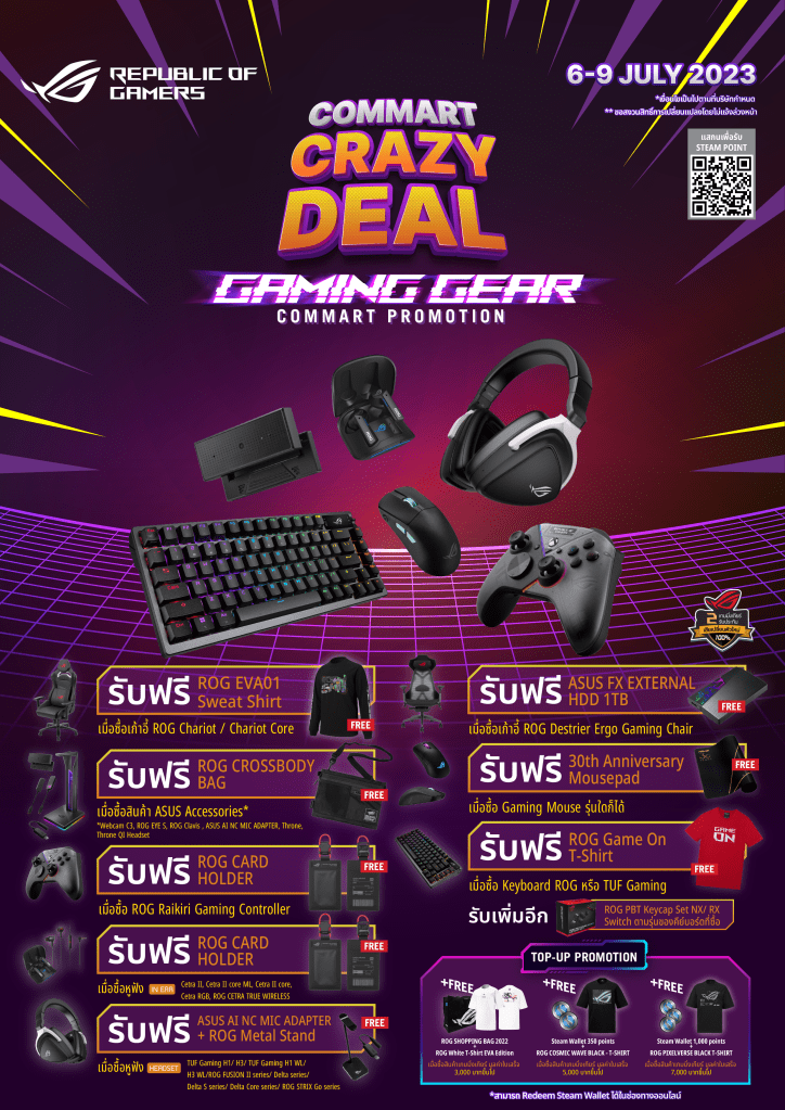 - เมื่อซื้อ Gaming Gear มูลค่ารวม 5,000 บาท ขึ้นไป (ภายในใบเสร็จเดียวกัน) รับฟรี Steam point 350 points และ ROG Cosmic wave black T-Shirt