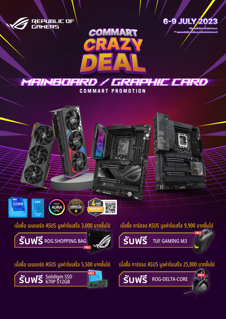- เมื่อซื้อ เมนบอร์ด ASUS มูลค่า 3,000 บาท ขึ้นไป รับฟรี ROG Shopping Bag