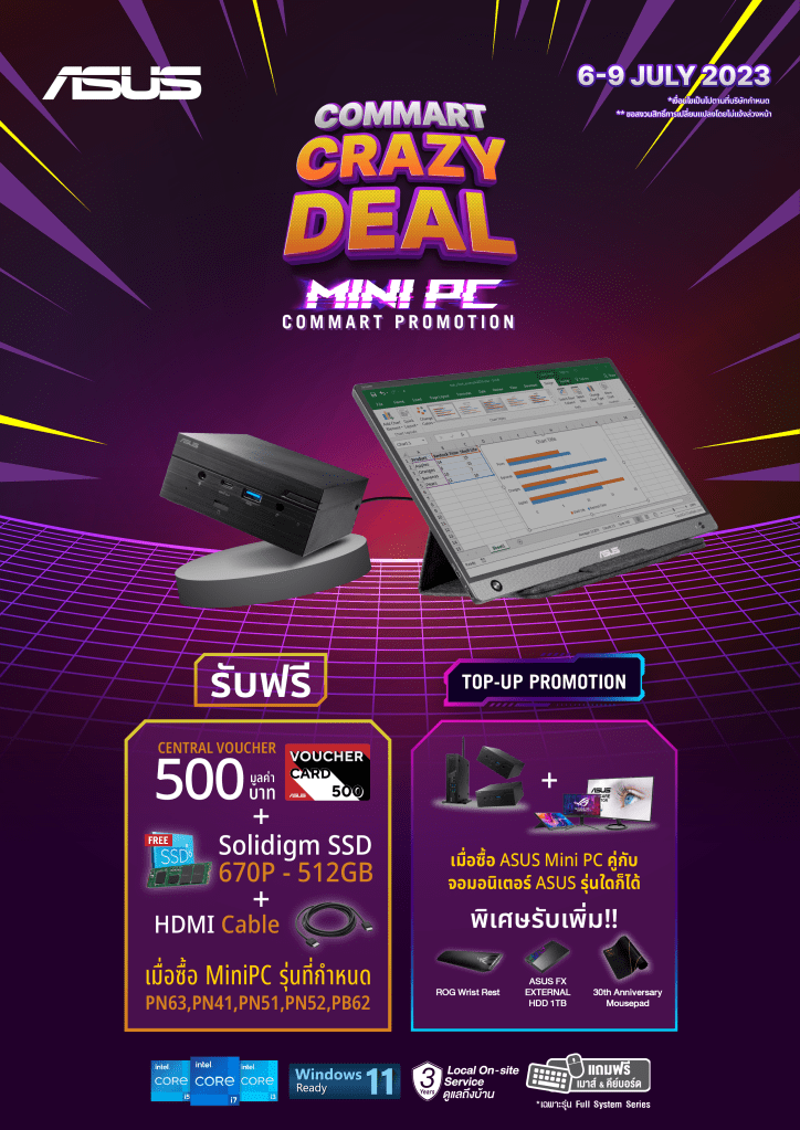 - เมื่อซื้อ Mini PC รุ่น PN63, PN41, PN51, PN52 และ PB62 รับฟรี บัตรกำนัลเซ็นทรัล มูลค่า 500 บาท, SSD 512 GB และ HDMI Cable