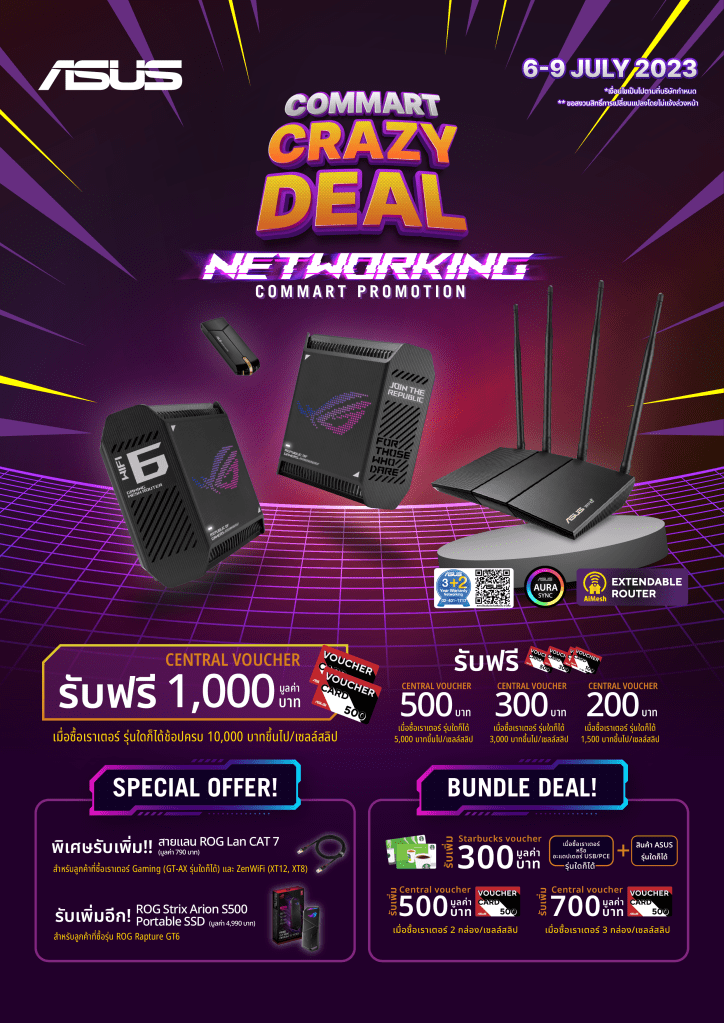 - เมื่อซื้อ ASUS หรือ ROG เราเตอร์ มูลค่า 10,000 บาทขึ้นไป ต่อ หนึ่งใบเสร็จ รับฟรี บัตรกำนัลเซ็นทรัล มูลค่า 1,000 บาท