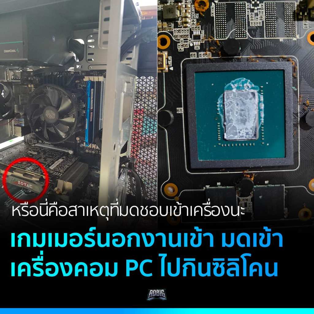 การ์ดจอต้นเหตุที่ว่านี้ก็เป็นรุ่น Zotac GTX 1060 ที่น่าจะมีการป้ายซิลิโคนมาให้จากโรงงาน และก็โชคดีที่ว่าความเสียหายนั้นไม่ได้มากมายอะไร แค่ปัด ๆ ทำความสะอาดออกก็สามารถที่จะกลับมาใช้งานได้ปกติ