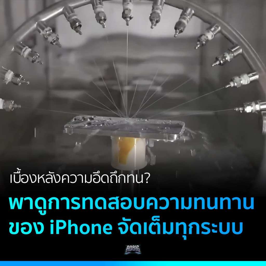 เท่านั้นยังไม่พอ ยังมีการใช้แขนหุ่นยนต์หยิบตัวเครื่องขึ้น และปล่อยลงพื้น เพื่อทดสอบความทนทานในการตกกระแทก แล้วจับภาพการตกด้วยกล้องความเร็วสูง เพื่อให้วิศวกรสามารถเห็นมุมการตกต่าง ๆ ได้อย่างชัดเจน