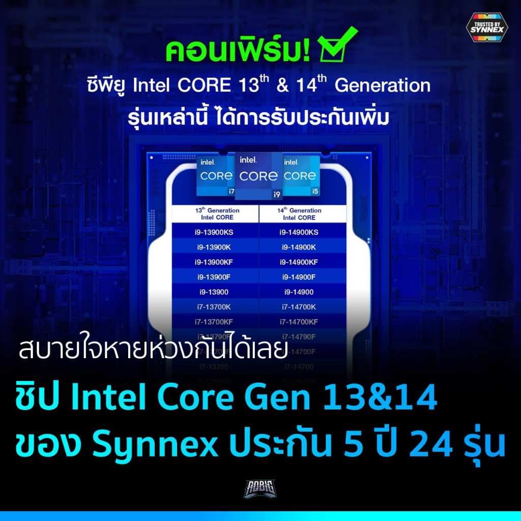 ก่อนหน้านี้ที่เราเคยรายงานข่าว Intel ขยายประกันชิป Intel Core Gen 13 และ 14 จากเดิมที่ประกัน 3 ปี เพิ่มขึ้นมาให้อีก 2 ปี รวมเป็นทั้งหมด 5 ปี 24 รุ่นตามนี้
