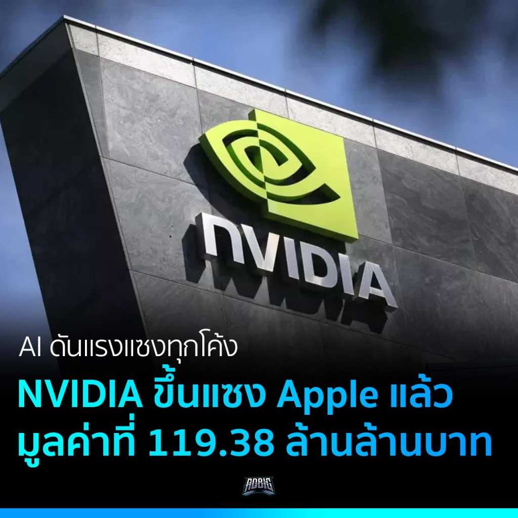 เมื่อวันศุกร์ที่ผ่านมา มูลค่าตลาด market cap ของ NVIDIA พุ่งสูงขึ้นไปแตะที่ 3.53 ล้านล้านเหรียญ หรือประมาณ 119.38 ล้านล้านบาทเป็นที่เรียบร้อยแล้ว แซงหน้า Apple ที่มีมูลค่าอยู่ที่ 3.52 ล้านล้านเหรียญ หรือประมาณ 119.06 ล้านล้านบาท