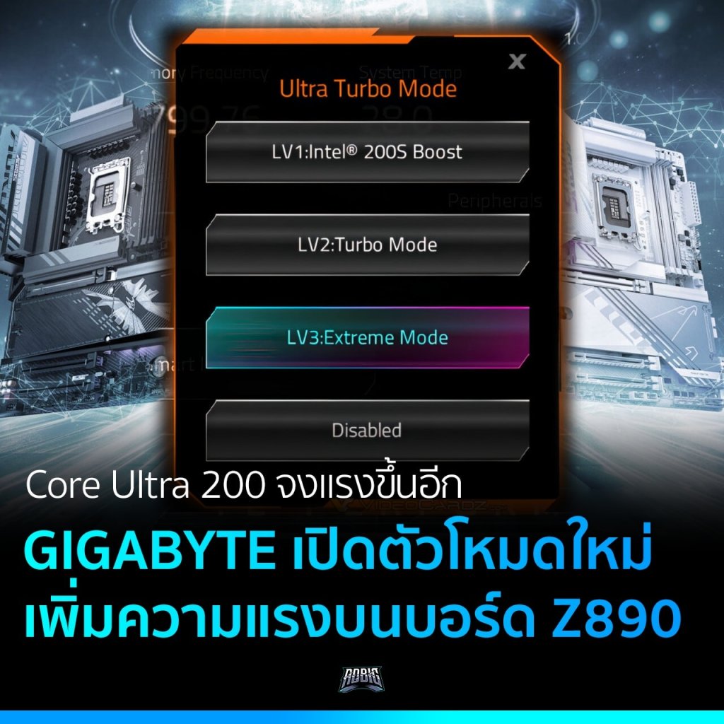 GIGABYTE เปิดตัว “Ultra Turbo Mode” สำหรับเมนบอร์ด Z890 ที่ช่วยบูสต์ประสิทธิภาพให้ชิป Core Ultra 200 ในการเล่นเกมเพิ่มขึ้นอีกสุงสุด 35% และประสิทธิภาพหน่วยความจำสูงสุด 68%