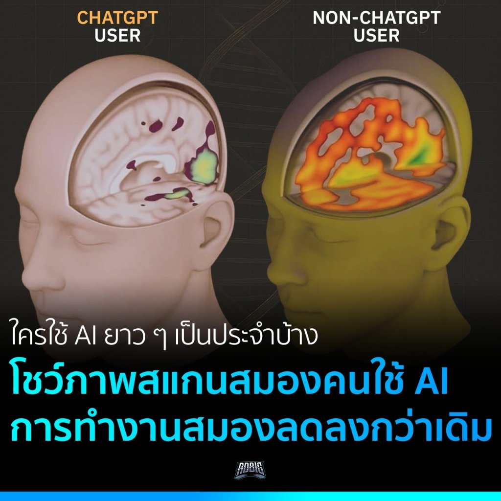 MIT โชว์ผลลัพธ์ภาพการสแกนสมองของผู้ใช้งาน AI อย่าง ChatGPT เปรียบเทียบกับคนที่ไม่ได้ใช้ ผลกระทบนั่นค่อนข้างน่าทึ่งทีเดียว โดยแบ่งเป็นประเด็นสำคัญได้ดังนี้